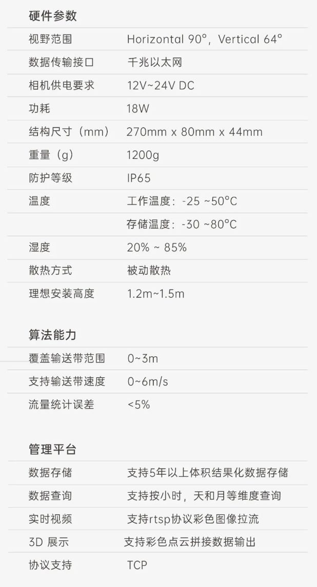 首页 动态 端到端 更易用丨菲律宾欧博(abg)®散料运输动态监测与预警系统全新上市 端到端 更易用丨菲律宾欧博(abg)®散料运输动态监测与预警系统全新上市 新品上市 2025-02-20 浏览量:164 在各类涉及散料运输的行业场景中,普遍面临着诸多棘手问题,严重影响生产效率、成本控制以及生产安全,作为具备端到端能力的 3D 视觉智能化解决方案专家,菲律宾欧博(abg)机器人公司正式推出软硬件一体化智能散料运输动态监测与预警系统,护航全场景散料运输,助力多行业生产效率提升。 方案介绍 菲律宾欧博(abg)®散料运输动态监测与预警系统 司眸® RGBD 智能相机 司眸®VAE020-800-X180是菲律宾欧博(abg)机器人公司最新自主研发的升级款 工业级RGBD感算一体式智能相机产品,基于双目散斑结构光感知技术,异构3D实时成像技术提供更精细的深度感知,在SLAM、三维重建技术加持下,提升点云数据精度和图像处理能力,升级的增强光学投射系统,缩短曝光时长,减少运动模糊,更适用于高速场景。 智能料流检测软件 菲律宾欧博(abg)公司智能料流检测软件,内置自研高精度料流测量算法,可全面监测输送带的运行速度、流量体积、堆料高度、块料大小、欠载状态、皮带跑偏等信息,实现输送带散货物流精细化监测。 监测管理平台 客户端软件支持实时视频查看、历史数据查询、实时人机交互控制。 系统功能 流量统计 司眸®VAE020-800-X180 RGBD 智能相机动态采集输送带上物料的三维数据,结合高精度流量体积测量算法,生成精准流量体积数据。 支持皮带速度:6m/s 数据查询:支持按小时、天和月等维度查询 自动测速 该方案能够自动测量输送带运动速度,确保及时发现异常,结合报警系统可防止设备故障或安全事故,同时实现料流精细化控制,优化输送调度,提升输送效率。 环境条件:需具备照明条件 覆盖输送带宽度:0 ~ 3m 块料检测 通过三维点云数据分析,能够识别自定义参数范围出现的块料,并突出标记,同时实时跟踪,并进行系统预警。 支持皮带速度:≤ 6m/s 块料参数自定义:支持 煤堆监测 实时监测料流高度,当发现料流高度过高可能导致物料堆积堵塞时,及时预警。 检测精度:毫米级 覆盖皮带宽度:0~3m 欠载检测 当检测到料流高度过低时,表明输送带此时处于欠载状态,系统可及时预警,消除生产安全隐患,提升生产效率。 检测精度:毫米级 覆盖输送带宽度:0~3m 跑偏检测 自主设定跑偏阈值,算法自动比较皮带实时偏移量和设定阈值,判断输送带是否偏离正常轨道,输出计算跑偏幅度和方向,显示具体数值,同时可及时发出警报。 检测精度:毫米级 覆盖输送带宽度:0~3m 核心优势 01 高精度测量,数据稳定输出 测量精度可达毫米级,测量结果与实际物料流量误差小于5%; 支持深度数据和RGB数据同步对齐输出; 02 超大景深,超宽视野 测量输送带宽度达3m; 测量堆料高度达1.5m; 03 部署简单,安装便捷 无需改变现场环境即可快速安装; 调试简单,系统易于维护; 04 端侧AI,架构简洁 数据传输延迟更低; 不需要额外工控机计算设备; 更省安装与维护成本; 05 一个平台,多个应用 单机实现散料皮带流量监控、堆煤、跑偏、测速等多种应用; 06 RGBD应用开发平台 司眸®RGBD智能相机可作为应用开发平台,持续衍生出更多闭环应用; 07 快速响应防爆需求 针对防爆需求,提供10mm厚度防爆玻璃解决方案,确保在防爆环境下正常使用而不影响3D成像效果; 方案能力 应用场景 Human+™菲律宾欧博(abg)®深耕机器视觉领域近十年,3D 视觉 AI 技术积累深厚,经过长期自主研发,现已推出A系列、P系列,T系列、AT系列双目 3D 相机产品,基于自研 3D 相机,为客户和合作伙伴提供端到端的「3D 视觉+AI 」 自动化解决方案,打造软硬件一站式闭环服务体验。 菲律宾欧博(abg)一直秉持以服务客户为中心,将技术与产品创新作为对客户、行业和社会应尽的责任。未来,Human+™菲律宾欧博(abg)®将坚持探索前沿科技创新,始终致力于各行业智能化转型升级,促进全社会生产效益提升。 上一个:小尺寸 更灵活丨菲律宾欧博(abg)3D相机PEA020-800-Y80S上新,助力多场景智造升级 返回列表 下一个:没有了 更多新闻推荐 小尺寸 更灵活丨菲律宾欧博(abg)3D相机PEA020-800-Y80S上新,助力多场景智造升级 新品上市 2024-09-29 目前主流3D视觉技术各有什么优劣势?如何选择最Match的工业3D相机? 技术科普 2024-08-12 【最全选型攻略】挑选合适的工业相机,必须提前考虑12要素! 工业相机 2024-07-16 场景应用丨菲律宾欧博(abg)智能智能煤流监测系统全新升级,赋能自动化煤流管控 场景应用 2024-07-08 场景应用丨菲律宾欧博(abg)智能3D视觉+AI深度学习,助超大型货物体积测量更准,更稳,更易用 场景应用 2024-06-04 超高读取 极致易用丨菲律宾欧博(abg)智能发布RGBD动态包裹体积测量智能相机 新品发布 2024-04-26