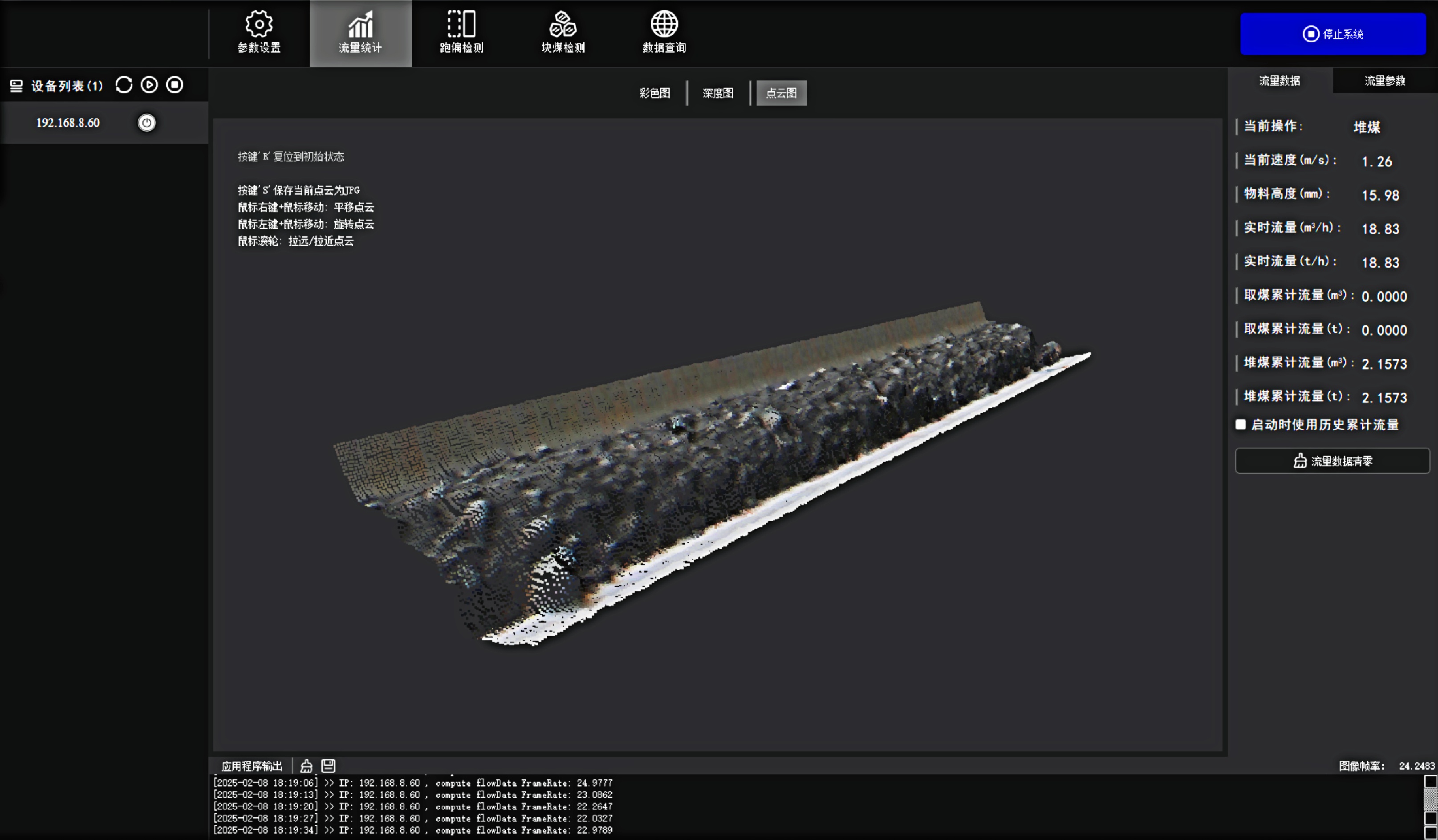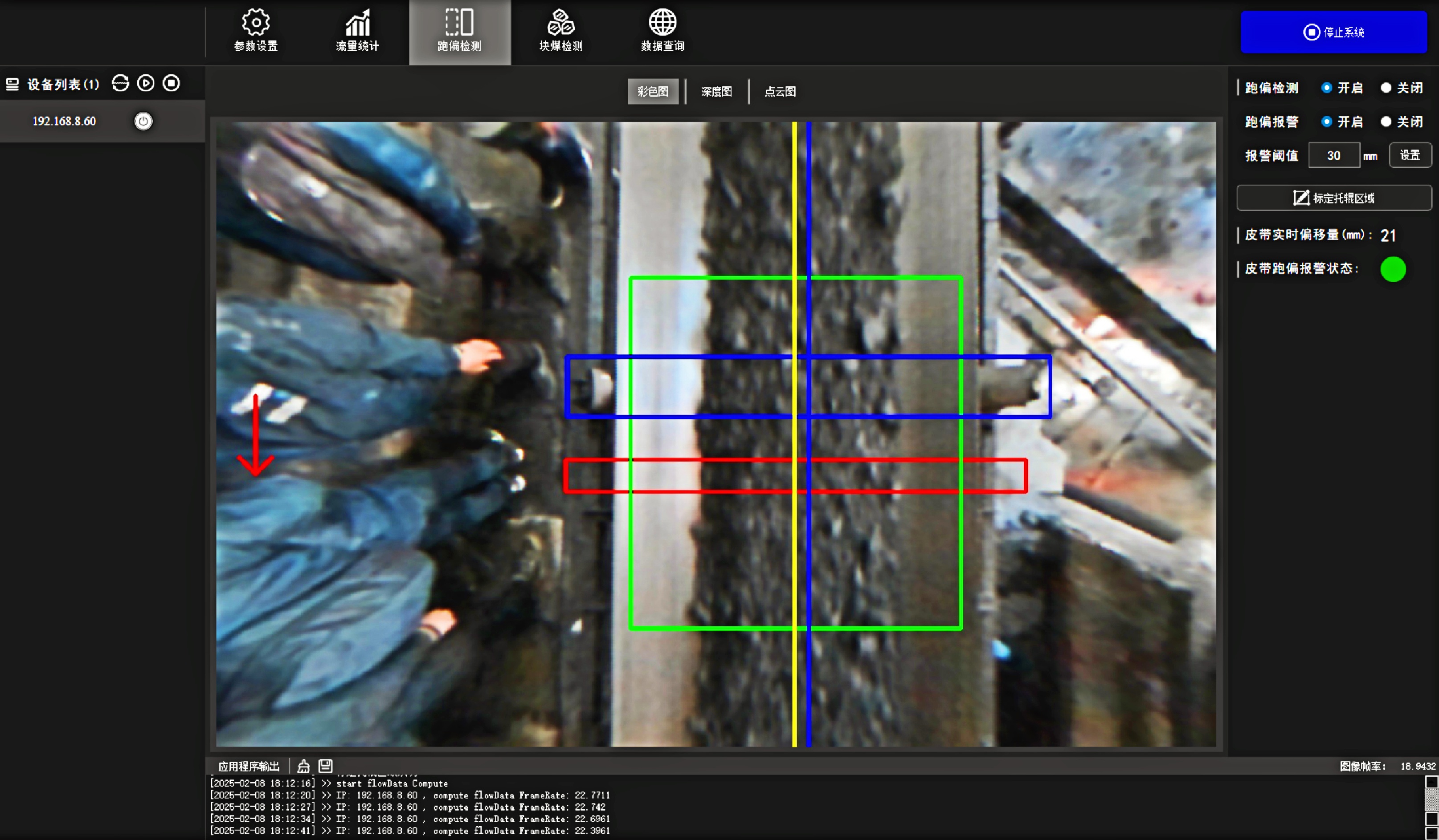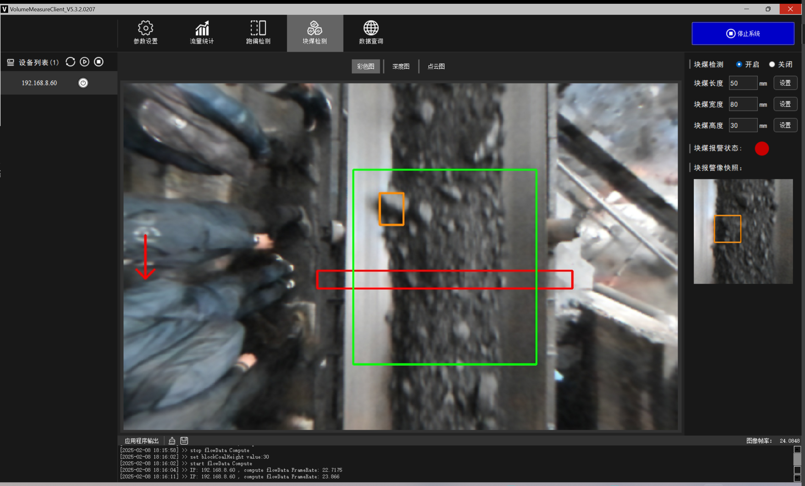 料型料流监测一体机系统 菲律宾欧博(abg)®智能料型料流监测系统由智能煤流监测一体机搭配监测平台构成,实时监测输送带工业散料流量,包含煤矿、砂石骨料、粮食等 首页 产品 3D相机 菲律宾欧博(abg)® 料型料流监测一体机 RBGD智能一体机 菲律宾欧博(abg)® 料型料流监测一体机 系统由智能料流监测一体机搭载监测平台构成,由稳定的底层硬件、嵌入式算法软件和自动化监测管理平台实现服务,实时采集高精度煤流RGBD数据,完成场景的实时三维彩色点云重建,对高速运动的皮带输送机进行精细化管理调控→应用场景: 煤矿检测系统精细化管理 定制解决方案 应用场景 煤流统计支持皮带速度6m/s,环境适应强,部署简单,无需改造现场环境即可安装块煤检测通过三维点云数据分析,能够对块煤的尺寸进行精确测量,准确计算出块煤的长、宽、高等尺寸数据输送带自动测速自动测量高速运动中的输送带速度,确保及时发现异常波动输送带跑偏检测通过获取的输送带三维尺寸位移信息,对皮带左右边缘位置与阈值比较并判断是否偏离正常轨道,同时计算跑偏幅度和方向煤流高度检测对煤流高度精准检测,能够有效管理煤流的分布、运输量、堆积情况 产品特点 测量误差<5%在高速动态检测上,测量精度可达毫米级,测量结果与实际煤量误差小于5%工业级硬件设计采用IP65防护等级和工业级防尘防水,可在高粉尘、大温差的情况下稳定运行室内暗光环境适用在室内、地下、夜晚能稳定测量,无需补光部署简单,安装便捷,支持二次开发出厂相机内参标定,可快速部署集成,无需改变现场环境即可安装,实施速度快,调试简单,系统易于维护接口丰富,数据直传丰富的系统对接接口,可直接对接PLC、变频器、服务器,快速完成精细化皮带控制大景深、大视野,多范围应用测量皮带宽度达2.4m;煤堆高度达1.5m边缘计算架构,实时测量使用边缘计算架构,将多种智能算法在边缘端实现,保证数据实时传输 性能参数 RGBD智能一体机型号VEA020-800-X180参数技术原理主动式双目基线长度180mm测量范围0.9m~2.5mZ向精度1m:≤1.3mm帧率25fps数据类型深度图、彩色图、红外图、点云图分辨率彩色图像:1280x800/640x400 ; 深度图像:1280x800/640x400像素形式彩色图: 8位三通道图 ;深度图:16位单通道图彩色视场角Horizontal 90°,Vertical 64°深色视场角Horizontal 90°,Vertical 64°RGBD同步对齐支持曝光类型全局曝光曝光控制自动/手动流量统计技术参数推荐安装高度1.2m~1.5m覆盖输送带范围0~3m支持输送带速度0~6m/s,推荐0~4m/s流量统计精度误差<5%物料高度测量支持,精度毫米级自动测速支持,安装位置需要具备照明条件实时流量统计 支持,统计周期支持配置跑偏检测支持,跑偏精度可达毫米级块煤检测 支持,支持块煤参数定义数据存储支持5年以上体积结果化数据存储数据查询支持按小时,天和月等维度查询实时视频支持rtsp协议彩色图像拉流点云数据支持彩色点云拼接数据输出协议支持TCP硬件参数数据传输接口千兆以太网相机供电要求12V~24V DC功耗18w结构尺寸(mm)270mm x 80mm x 44mm重量(g)1200g防护等级IP65温度工作温度:-25 ~50°C ;存储温度:-30 ~80°C湿度20% ~ 85%散热方式被动散热软件支持开发环境Windows/Linux数据协议TCP数据查看流量统计客户端 点云图 资料下载 菲律宾欧博(abg)® 煤流体积测量输送带监测管理平台 产品资料下载 请填写此表格并点击提交后,程序会自动下载文件 *合作意向 请选择 商务合作 媒体合作 投资者合作 *电话 *姓名 公司 行业 职位 邮箱 地址 您的留言 提交并下载资料 您也可以拨打菲律宾欧博(abg)的客服电话:010-81046658 联系菲律宾欧博(abg)